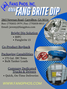 Fang Phos supplies phosphoric acid, while Fang Bright Dip manufactures and distributes Bright Dip solutions like 80FC and Fangbrite 15. Both can be transported via 275 gallon IBC totes or bulk tanker loads. The company utilizes multiple suppliers and trucking companies to provide customers the best pricing and fast delivery, along with the option of co-product buyback.
